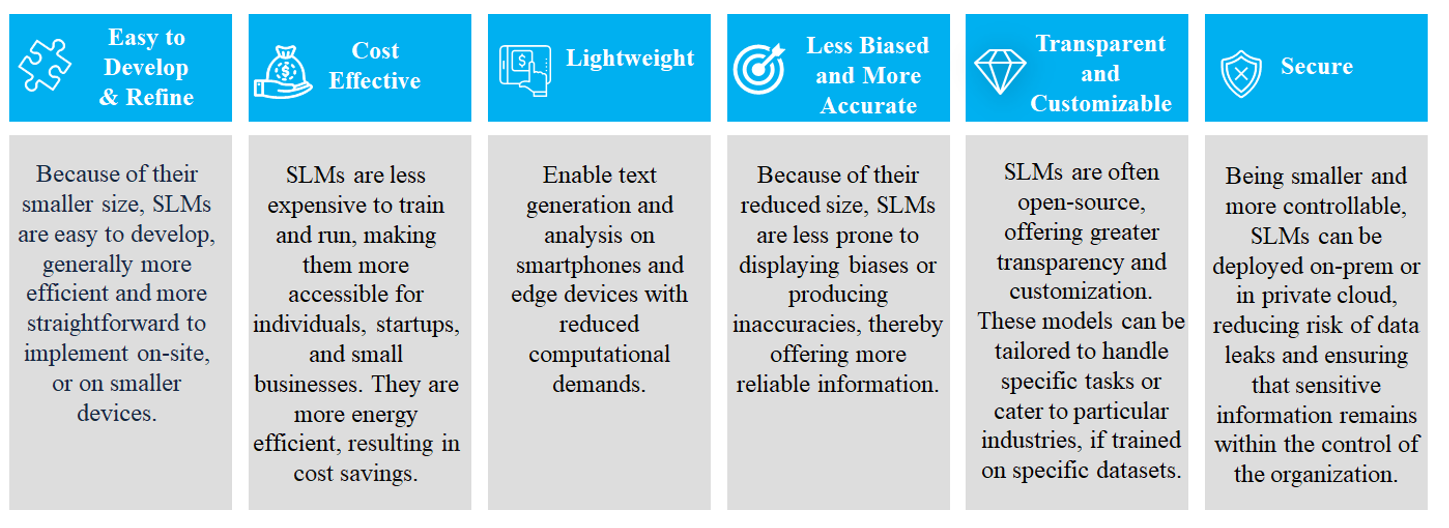 In numerous business scenarios, SLMs strike a crucial balance between capability and control, offering a practical solution for responsible AI integration. As organizational leaders seek to enhance operations with AI, SLMs present themselves as a viable option worthy of consideration, aligning performance with the imperative of responsible usage. The difference between SLMs and LLMs have been highlighted in the following table.